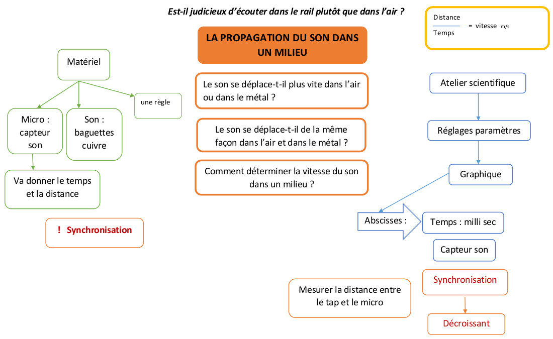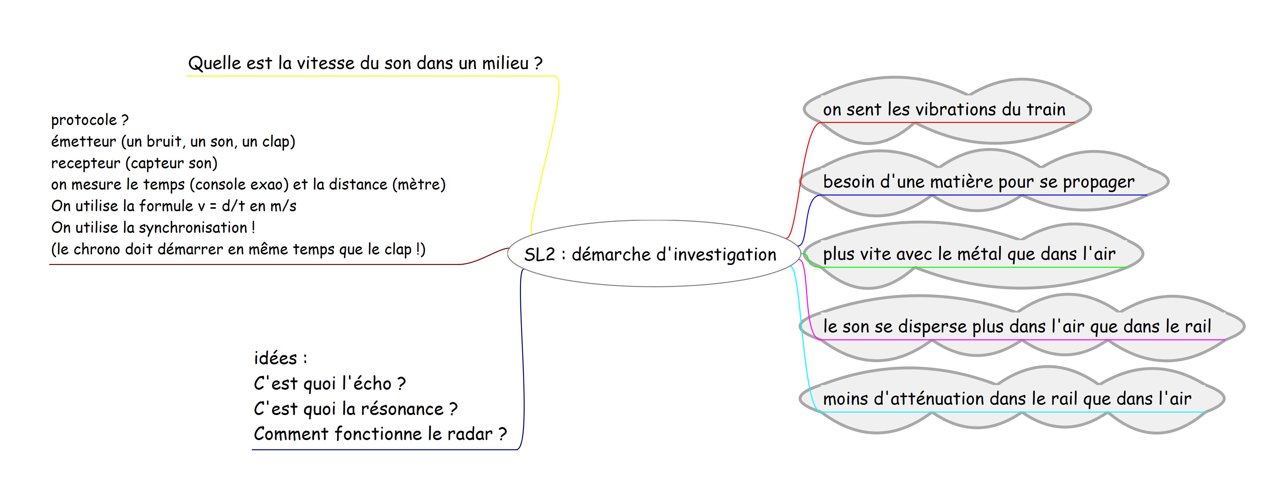 Mise en commun des idées des élèves et réalisation en direct d'une carte mentale. Cette carte permet ensuite de trier les idées et de dégager le sujet principal (la vitesse du son dans un milieu ici l'air et l'acier)Remarque : Un groupe est accompagné d'une AVS (assistante de vie scolaire) qui prend note pour un élève. La carte mentale est réalisée par cette personne pour l'élève mais aussi pour tout le groupe. Dans le deuxième groupe le professeur assure le rôle de secrétaire.