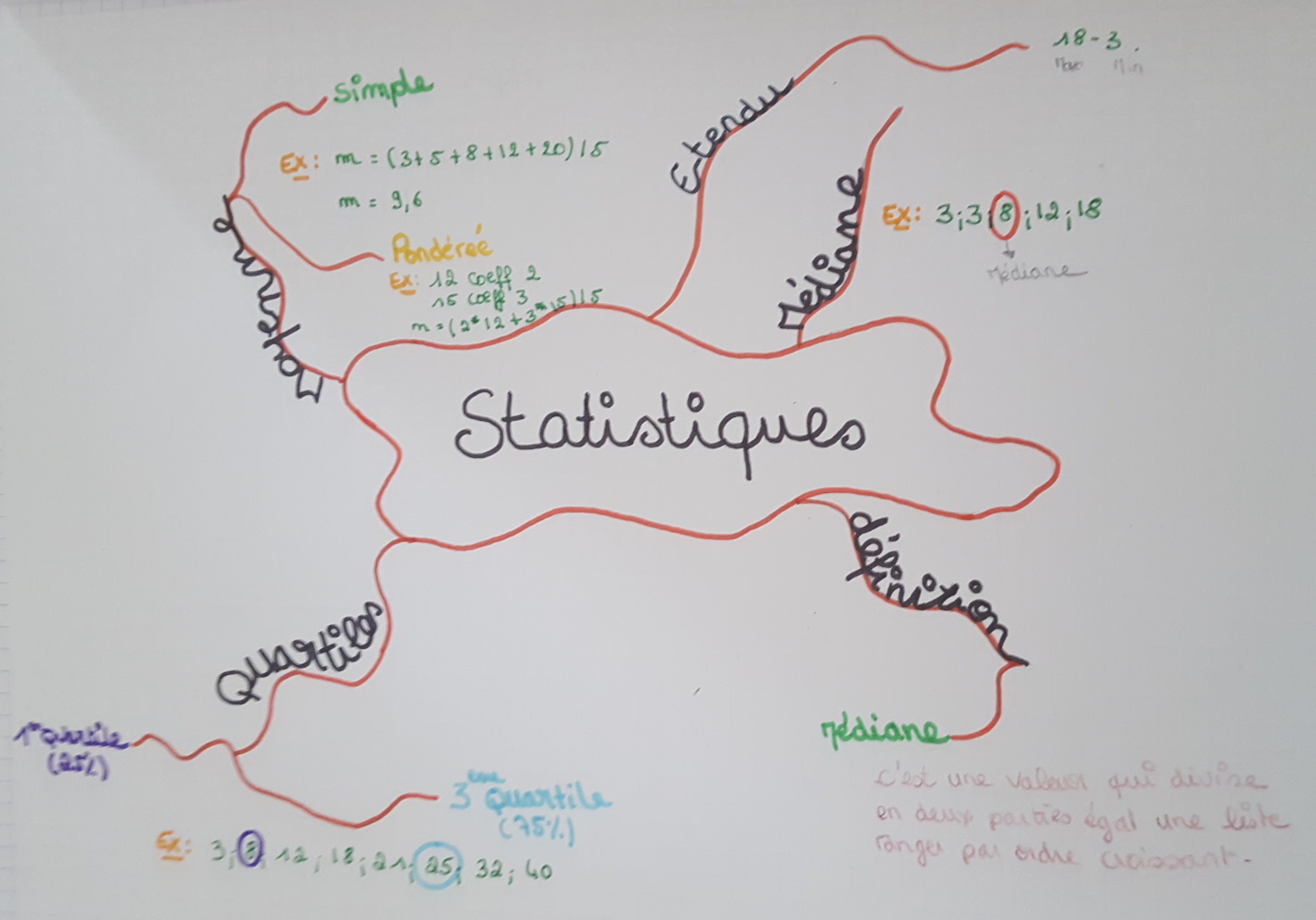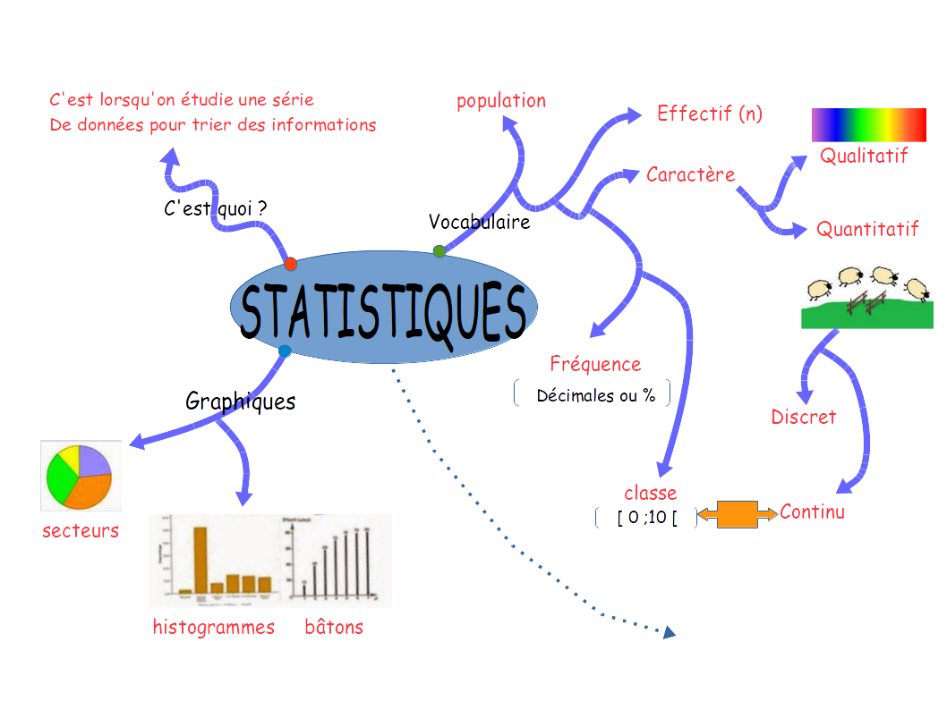 A la fin d'un premier chapitre sur les statistiques, l'enseignant présente dans un diaporama animé une carte mentale qu'il a élaborée.Le diaporama répond à un questionnement rappelant les notions de ce chapitre :- Les statistiques, c'est quoi ?