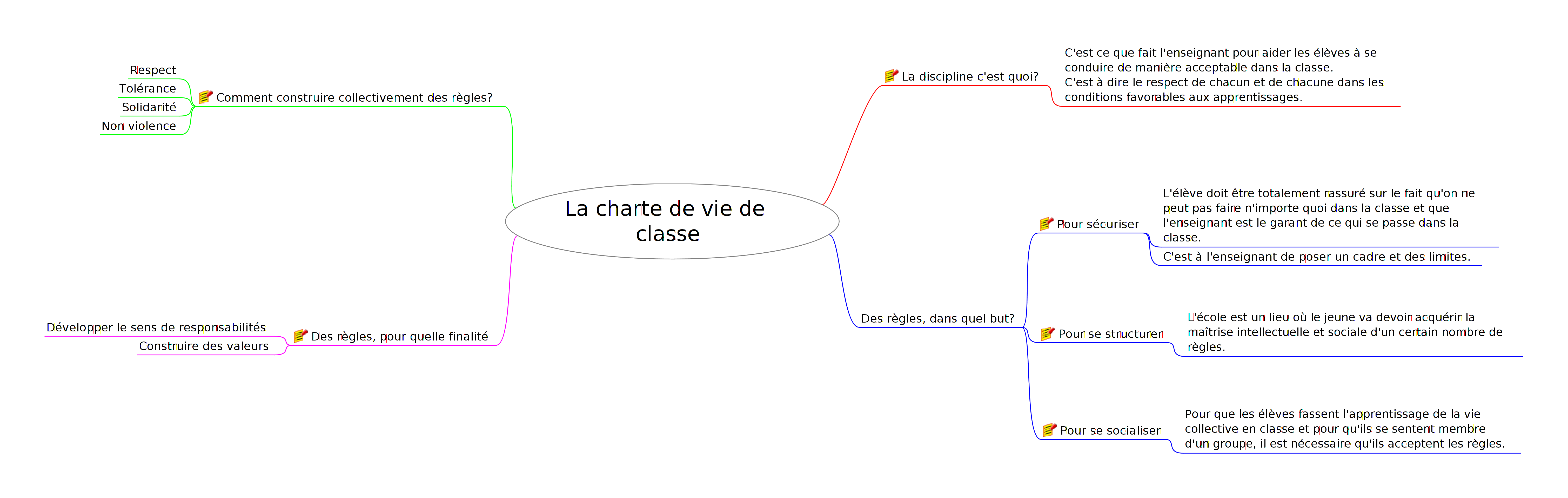 Pour une bonne gestion de classe, l'enseignant met en place avec et par les élèves une charte de vie de classe. Ce sont les élèves qui mettent en place les règles à respecter pour un bon climat de classe.La charte est ensuite finalisée pendant une heure de vie de classe.Le document final est ensuite signé par l'élève et par son représentant légal et diffusé auprès des parents par l'intermédiaire de E-Lyco.