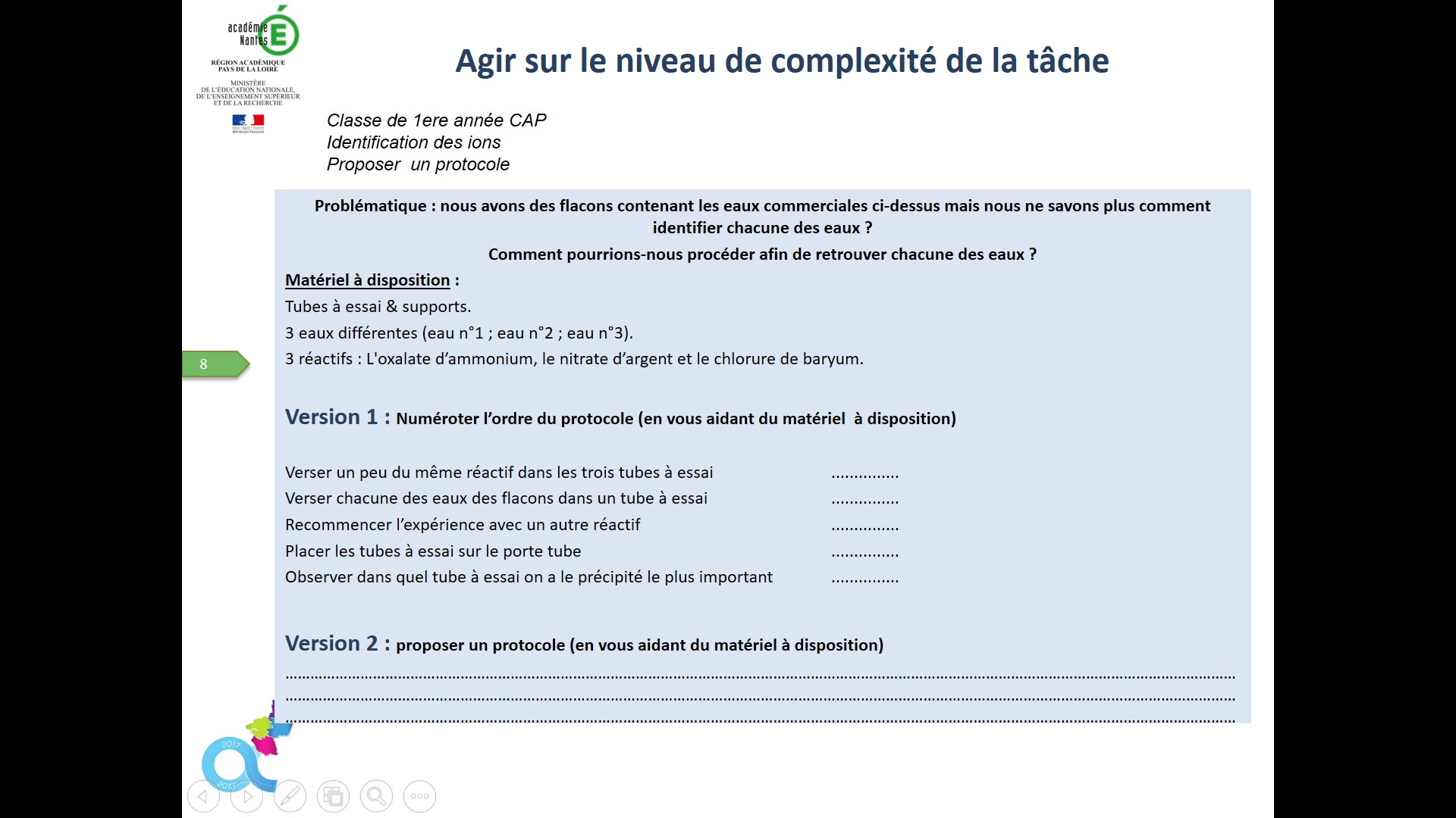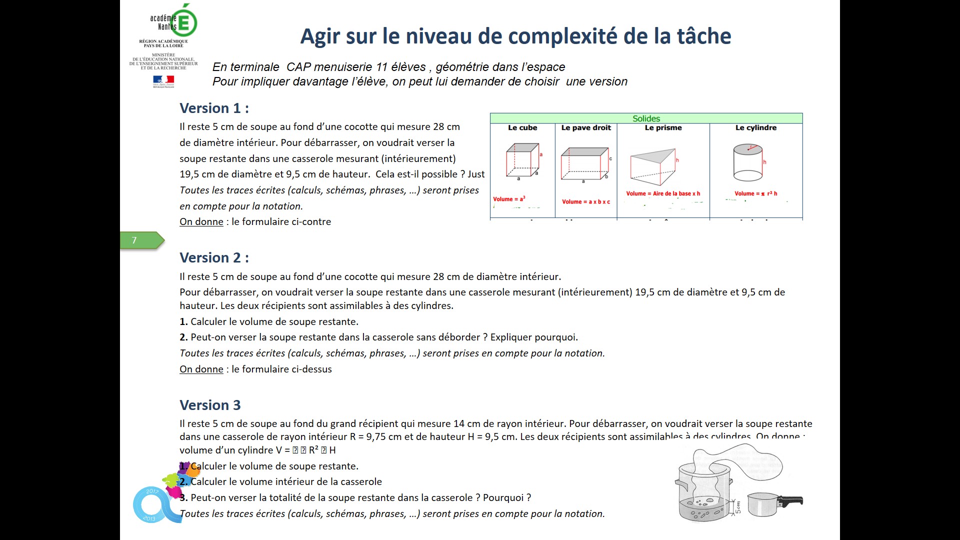 - la tâche : nombre de tâches à effectuer, simplifier ou complexifier la tâche, activités de réinvestissement, activités pour aller plus loin