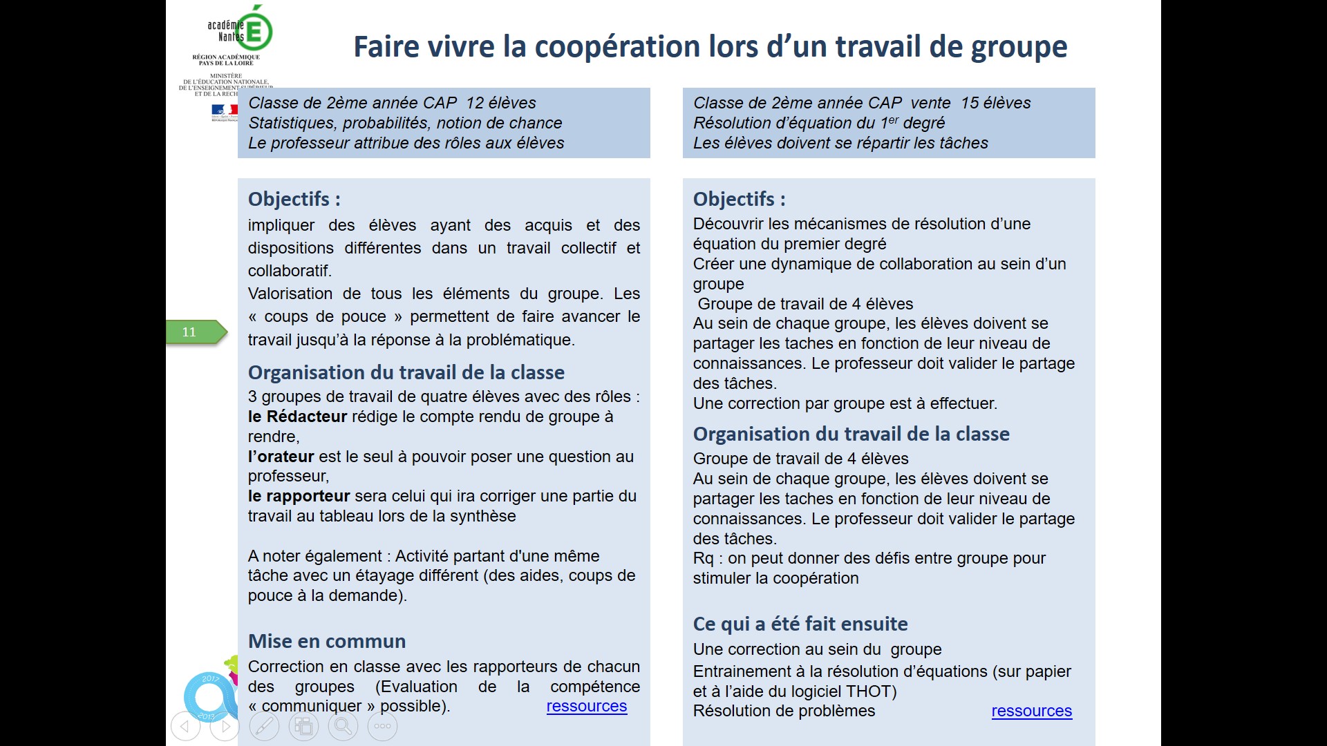 - l’organisation de la classe : travail individuel ou en binômes, groupes homogènes, hétérogènes, …