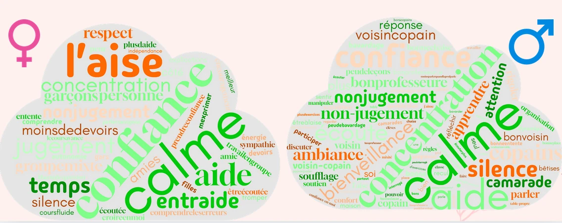 Les filles ont davantage évoqué des besoins liés à la confiance, au soutien et à la bienveillance, exprimant une forte attente de reconnaissance individuelle et de cadre rassurant.