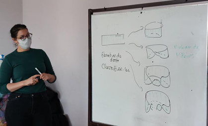 À partir d’une bande de papier et de différentes façons de coller deux extrémités (en cylindre, en ruban de Möbius, …), Mme Zimmermann a expliqué comment on pouvait reconnaitre des invariants, par exemple des droites. Elle a nommé cela « fibrations de droites ».