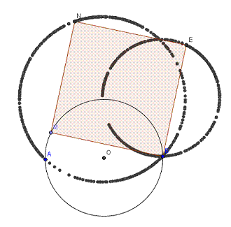 Il s'agit d'explorer une situation à l'aide d'un logiciel de géométrie dynamique. Le questionnement proposé permet de repérer des invariants de la figure. La trace activée du point E permet de conjecturer que le point E décrit un cercle de même rayon que le cercle (C). On peut conjecturer que le point N décrit un cercle