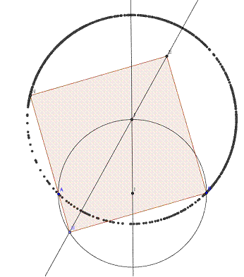 de centre F ayant un rayon environ 1,5 fois plus grand que le rayon de (C). On découvre que la droite (ME) passe par un point fixe qui est le point F.
