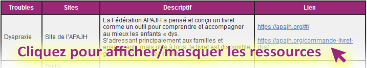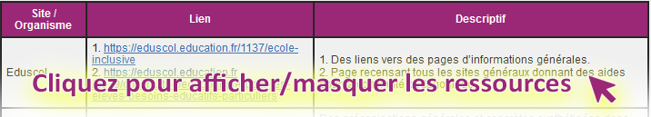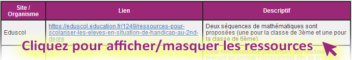 Institut National Supérieur de Formation et de Recherche pour l’Education des Jeunes Handicapés et les Enseignements Adaptés (INS HEA) Des outils (numériques) ou des idées de projets sont proposés en ressource, en fonction des besoins des élèves : site très riche.