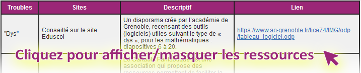Un diaporama crée par l’académie de Grenoble, recensant des outils (logiciels) utiles suivant le type de « dys », pour les mathématiques : diapositives 6 à 20.