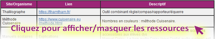 Liste non exhaustive présentant des ressources prenant en compte l’accessibilité afin de proposer des conditions favorables d’enseignement pour tous. Des outils numériques, des ressources en ligne mais aussi des témoignages pouvant être utiles à l’inclusion en mathématiques des élèves en situation de handicap.
