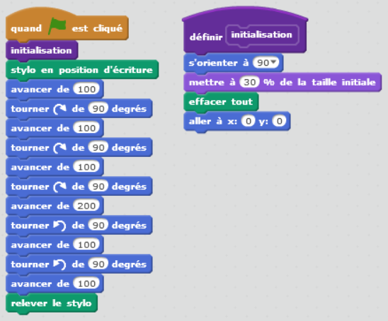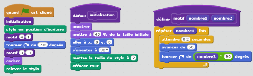 Un programme permet à un robot de se déplacer sur les cases d’un quadrillage. Chaque case atteinte est colorée en gris. Au début d’un programme, toutes les cases sont blanches, le robot se positionne sur une case de départ indiquée par un « d » et la colore aussitôt en gris. Voici des exemples de programmes et leurs effets :