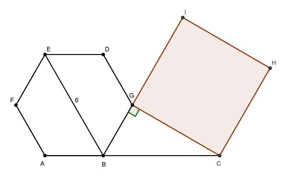 ABGDEF est un hexagone régulier (mêmes angles, mêmes longueurs de côtés). La diagonale [BE] mesure 6 cm. BGC est un triangle rectangle en G. GCHI est un carré. Calculer l’aire du carré GCHI. | Une aide : indiquer le bon mot de passe sur ce lien, et il y aura un accès à une aide. (Possibilité aussi d’utiliser ce QR code avec un téléphone ou une tablette) Pour obtenir ce mot de passe (à écrire en minuscules) : nom d’un mathématicien en lien avec la question posée. |