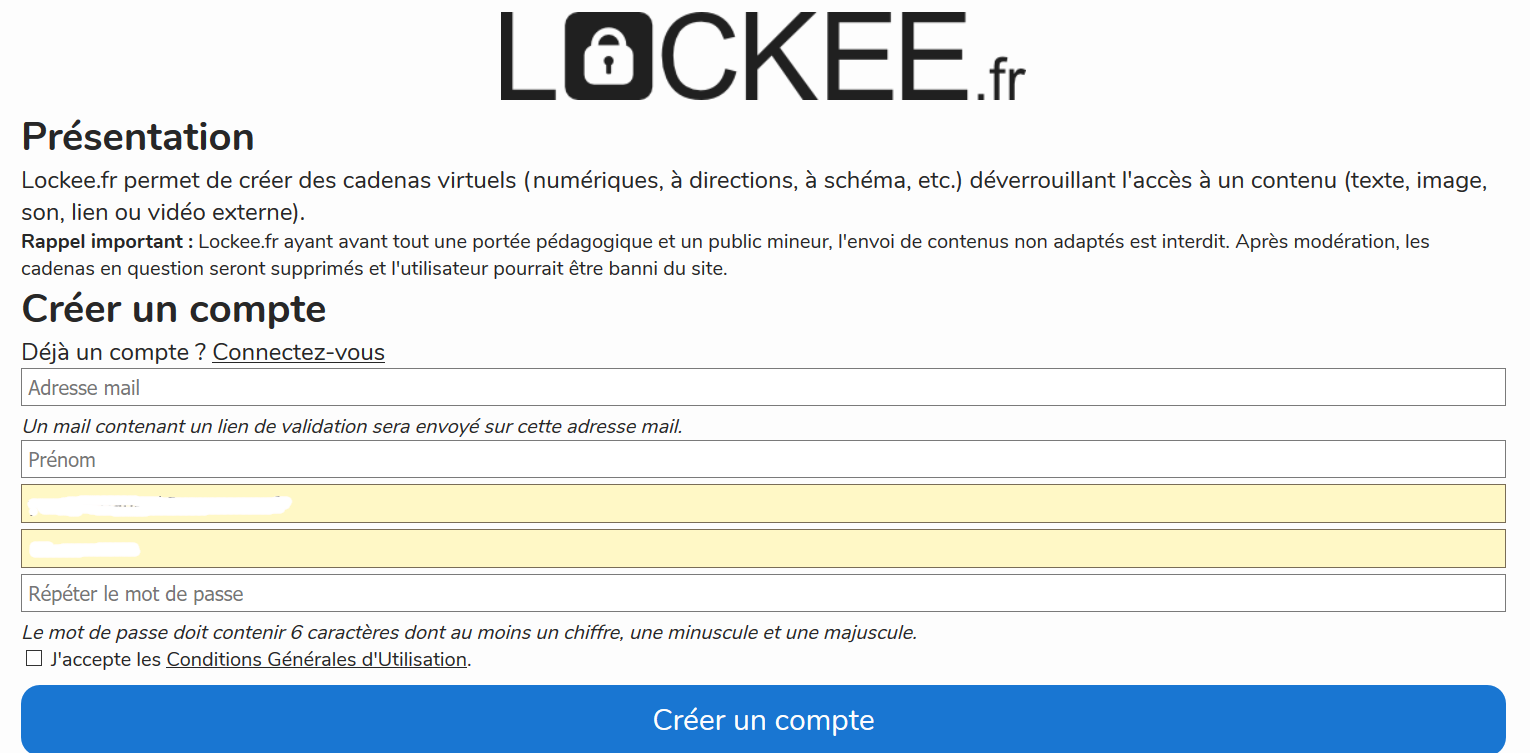 Lockee.fr permet de créer des cadenas virtuels (numériques, à directions, à schéma, etc.) déverrouillant l'accès à un contenu (texte, image, son, lien ou vidéo externe).