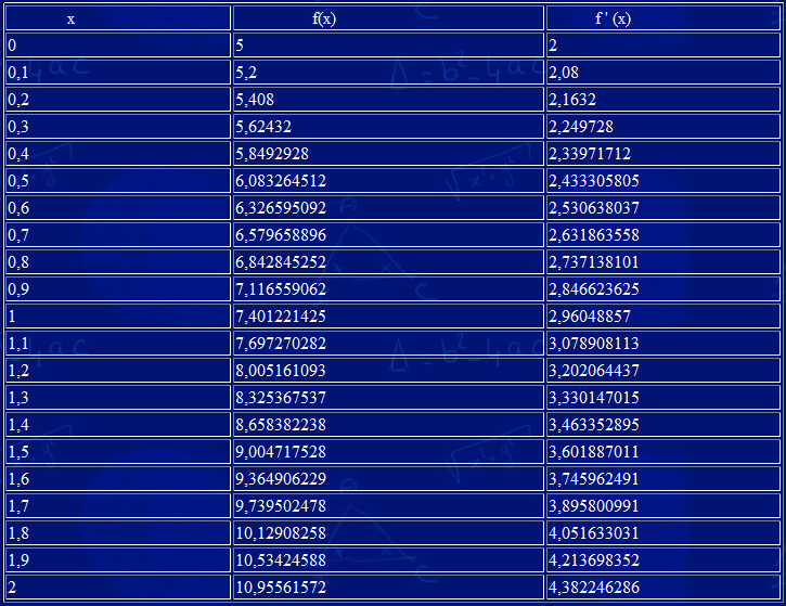 Je choisis par exemple h = 0,1 et je trouve f (0,1) peu différent de 5,2 La fonction f est une solution de l'équation posée donc f ' (0,1) = 0,4 f(0,1) . On peut déduire f ' (0,1) peu différent de 2,08 et ainsi de suite. On calcule successivement f(0,2) puis f ' (0,2) puis f(0,3) puis f ' (0,3) etc... Les valeurs obtenues figurent dans le tableau ci-dessous.