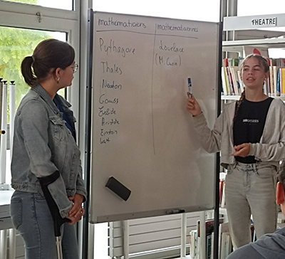 Cette exposition est à destination des classes de 4eme qui ont passé chacune une demi-heure au CDI pour la découvrir. Le but étant de susciter l'envie de travailler dans le domaine des mathématiques pour tous les élèves et en particulier encourager les filles à choisir une filière scientifique, filière dans laquelle elles sont encore bien trop sous représentées.