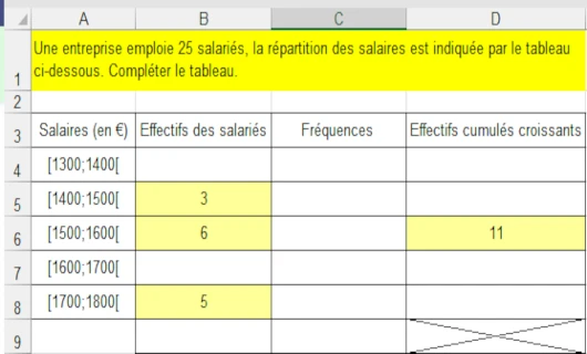 Compléter un tableau de données dans un tableur. Les effectifs sont incomplets et doivent être retrouvés à l'aide des effectifs cumulés.