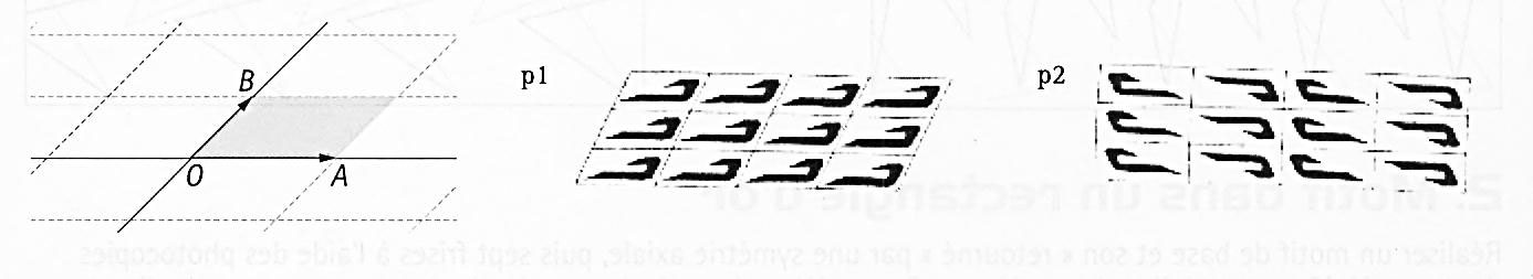 Le pavé de base permet d'obtenir une maille qui se répète suivant deux translations de directions différentes (de vecteurs non colinéaires). Cinq mailles sont traitées ci-après.