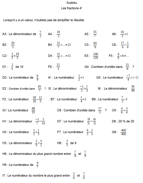 Un exemple de grille Un exemple (fractions) de questions pour préremplir la grille.