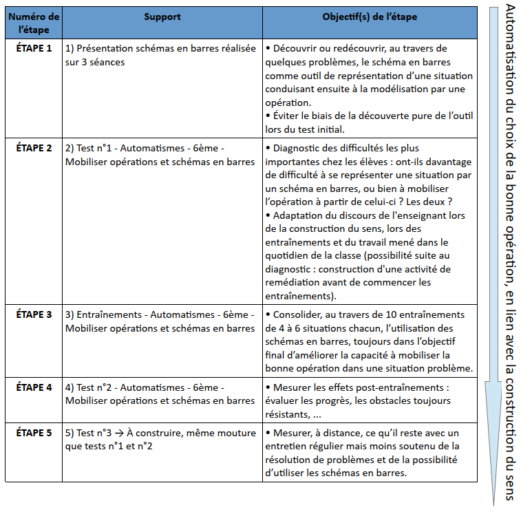 Ce document a pour objectif d'expliciter la mise en œuvre de notre expérimentation sur la mobilisation des opérations à l'aide des schémas en barres. Pour plus de détail, on pourra se référer au document « Présentation et analyse ». En effet, l'objectif d'automatisation recherché à travers l'utilisation de ces ressources vient en complément d'un indispensable travail sur le sens des opérations, détaillé dans le deuxième document.