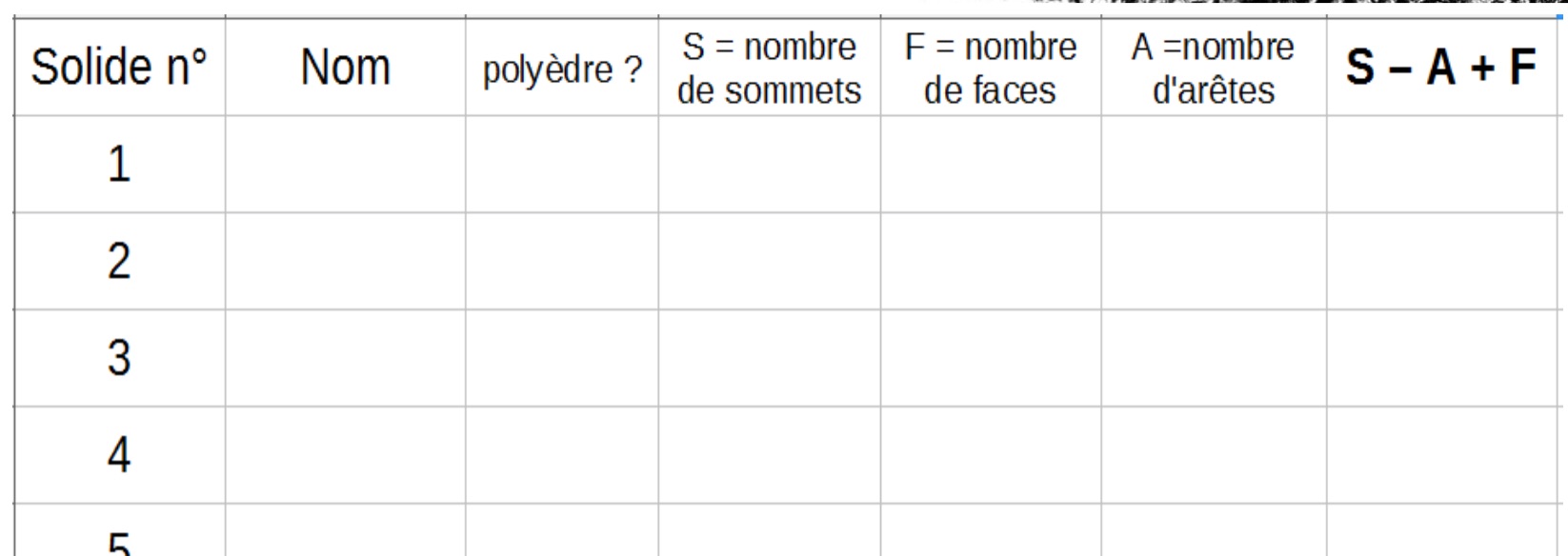 Ils remplissent un tableau synthétisant le nombre de faces, le nombre de sommets et le nombre d'arêtes de chacun d'eux.
