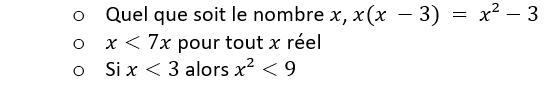 Il s’agit ici de tester des valeurs, de façon réfléchie, pour montrer que ces inégalités sont fausses. Cela peut aussi être effectué à l’aide d’un tableur. Les inéquations ne relèvent pas du programme de cycle 4. Toutefois, dans le cadre du travail sur la notion d’expression littérale et du sens de celles-ci, il peut être pertinent, éventuellement dans le cadre de la prise en compte de la diversité des élèves, de proposer des situations amenant à des inégalités et inéquations. Commencer, sans les résoudre, à construire la signification de telles équations permet de préparer l’approche qui sera faite en classe de 2nde.