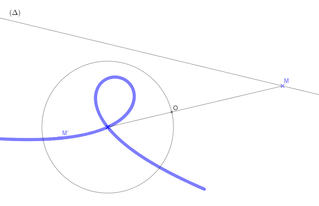 Transformations : voir des transformations non isométriques Projection stéréographique (https://thetruesize.com) orthogonale. Ci-dessous l'image d'une droite par rapport au point O, intersection du segment reliant le point M dont on cherche l'image au centre d'un cercle avec le cercle...
