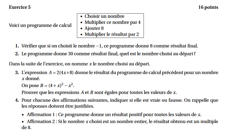 Affirmation 1 de la question 4 de l'exercice 5 du brevet des collèges (métropole - juin 2018)