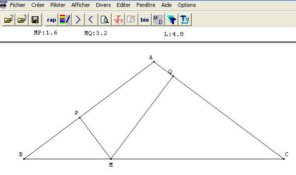 On considère un triangle équilatéral ABC . On place sur un de ses côtés un point mobile M. On définit les points P et Q comme projetés orthogonaux de M sur chacun des deux autres côtés.