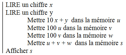 3. A partir de deux chiffres quelconques x et y saisis dans cet ordre, on lance le premier algorithme qui fournit un nombre entier naturel s. A partir de ce nombre s, on lance le deuxième algorithme.