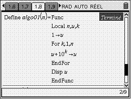 Faire fonctionner ce premier algorithme. Comment s'écrit le nombre s à la sortie de l'algorithme ?