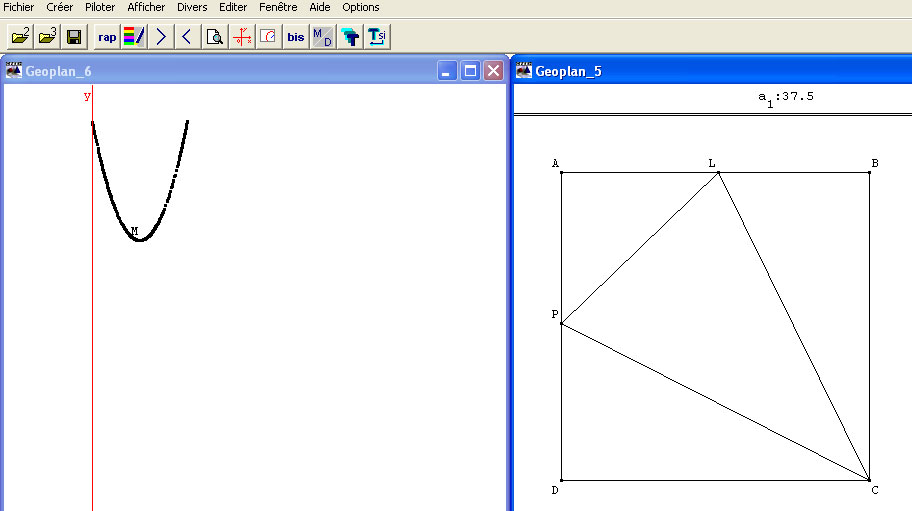 Les élèves peuvent aussi travailler sur deux fenêtres pour faire le lien entre la situation géométrique et la courbe de la fonction mise en oeuvre.