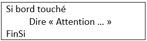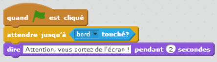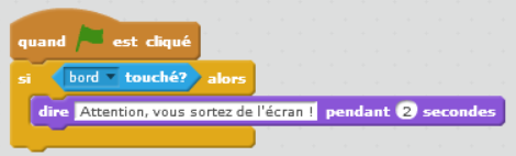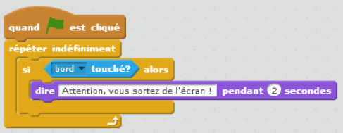 Pourtant, lorsqu’on clique sur le drapeau vert pour commencer et que l’on déplace le lutin au clavier, le message ne s’affiche pas lorsque le lutin touche un bord.