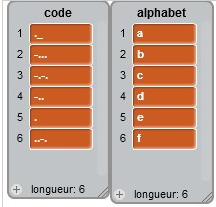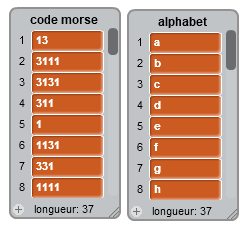En général, deux listes ont été créées : l’une avec les lettres de l’alphabet (cette liste peut être remplacée par une variable : abcdefkhijklmnopqrstuvwxyz) l’autre avec le code morse codé ! Le trait court est remplacé par 1 et le trait long par 3. Deux raisons à cela : en morse, un trait long correspond à trois traits courts ; de plus, il est facile de manipuler des nombres en informatique. Une autre option aurait été de faire une seule liste comme dans l’extrait ci-contre. | |