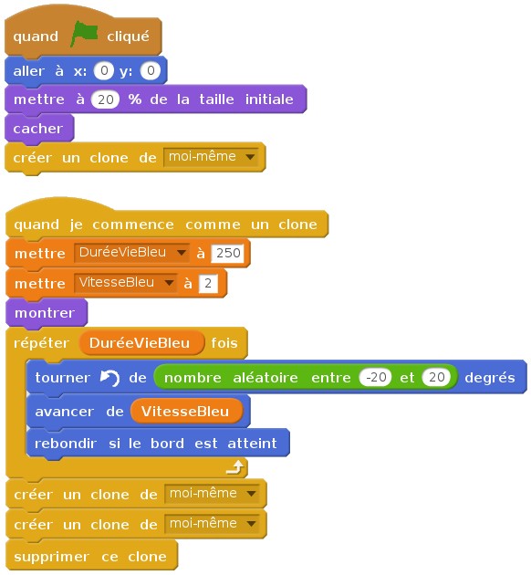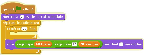 Les variables NbBleus et NbRouges sont cette fois-ci des variables globales (Pour tous les lutins). Il faut modifier le programme du lutin Bleu et du lutin Rouge : (a) Mettre la variable NbBleu ou NbRouge à zéro au tout début. (b) Augmenter de 1 lorsqu’on crée un nouveau clone. (c) Diminuer de 1 lorsqu’on supprime un clone.
