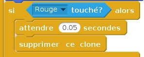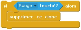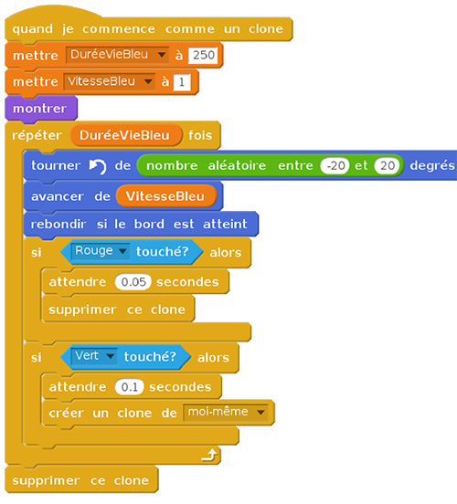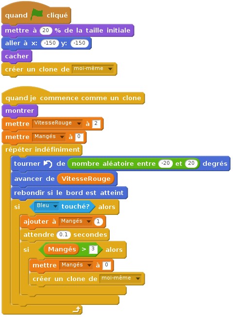 Modifier le programme du lutin Rouge comme ci-contre. La variable Mangés est définie localement, c'est-à-dire "Pour ce lutin uniquement". Remarque : la brique attendre évite un bug dans le programme où un lutin Rouge pourrait manger plusieurs fois le même lutin Bleu avant que celui-ci ne soit détruit. Modifier aussi, pour la même raison, le programme du lutin Bleu comme suit :