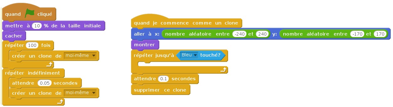 On souhaite maintenant que notre insecte se multiplie. Avant d'être détruit, il engendre deux copies de lui-même. Pour cela on utilise l'outil créer un clone de Scratch.