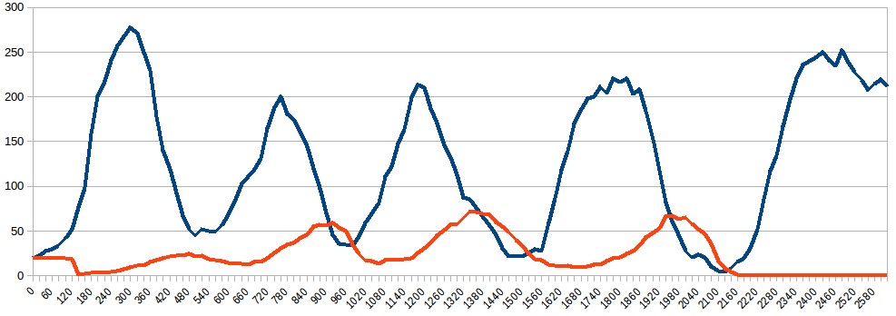 En abscisse : le nombre de boucles parcourues (temps). En ordonnées : le nombre de lutins de chaque espèce.