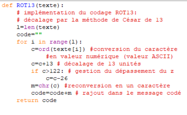 Codage par décalage dit de César : L’idée est que chaque lettre est décalée dans l’alphabet. Pour un décalage de 3 par exemple, les « A »deviennent des « D », les « B »des « E », ...,les « Z »des « C ». Le codage Rot13 ci-dessous correspond à un tel décalage par 13. Il a l’avantage d’être son propre programme de décodage.