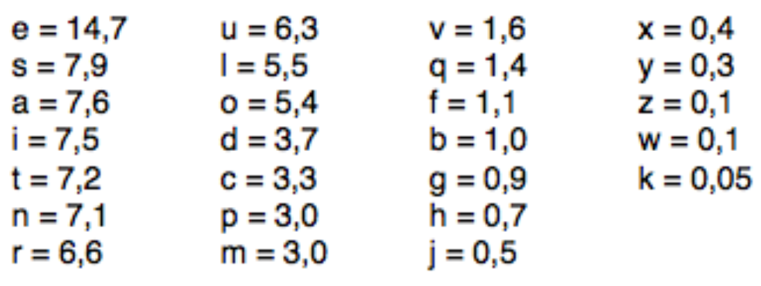 Décodage par attaque statistique : pour découvrir la permutation utilisée, on effectue un relevé statistique. En effet en français la répartition des lettres est la suivante :