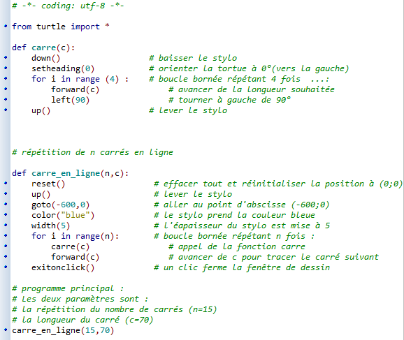 Tracer des carrés imbriqués, un carré de carrés, une spirale de carrés (colorisée ou non), une pyramide de carrés.