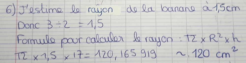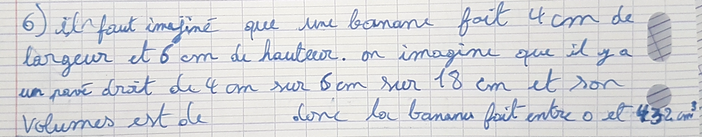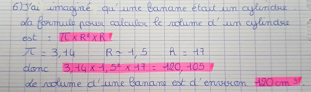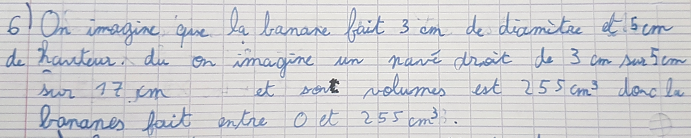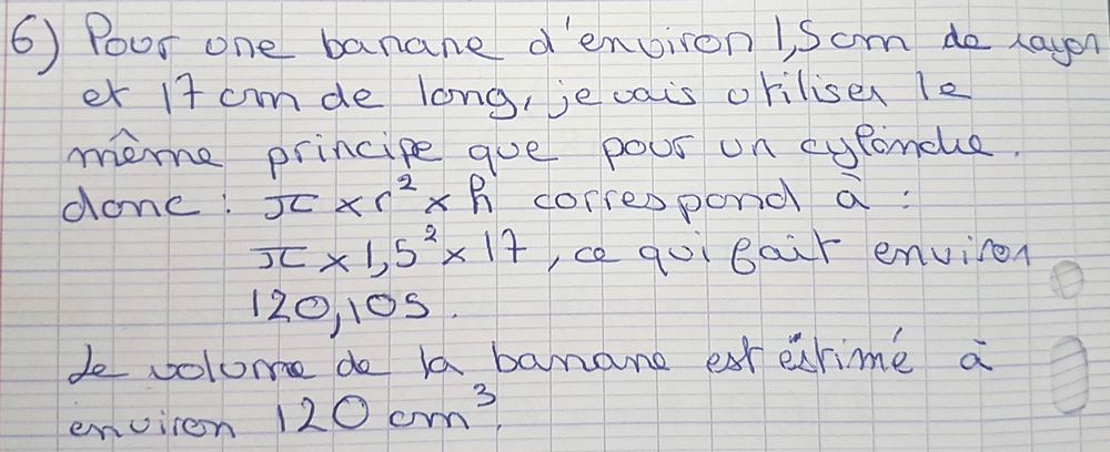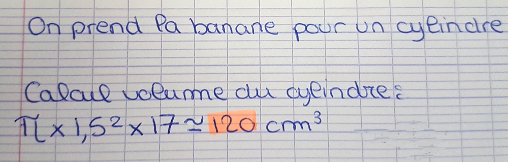 Dans le cadre d’un devoir maison, une classe de 3e a eu à estimer le volume d’une banane. L’énoncé indique que la banane, légèrement courbée, mesure 17,78 cm.