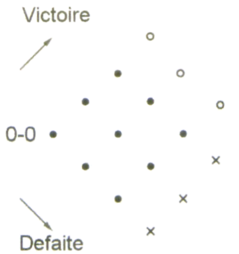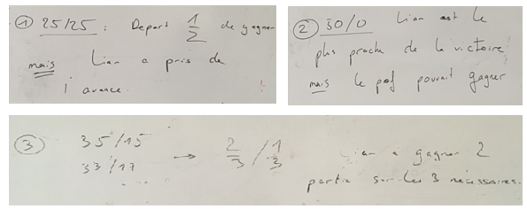 Quel que soit l’instrument choisi, on peut voir que le modèle communément choisi n’est pas représentatif de la réalité. Une fois admis cela, les élèves ont de nouveau réfléchi au problème et l’idée qui a émergé est proche de celle de Pierre de Fermat (voir plus loin) : Liam doit gagner une seule des deux parties suivantes alors que je devais gagner les deux.