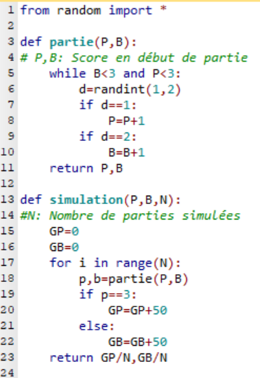 Les élèves proposent d’essayer en classe pour voir : finir la partie une vingtaine de fois pour vérifier si leur proposition tient la route. On a donc ensemble essayé avec des dés puis créé un programme Python pour accélérer le processus (Un fichier Tableur est aussi possible) Le résultat obtenu semble assez éloigné de la proposition initiale pour remettre en doute ce modèle |
