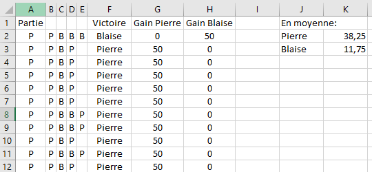 Il fait ensuite la liste des fins possible (il imagine une cinquième partie dans tous les cas même si elle s’avère inutile) : PPBBB, PPBBP, PPBPB et PPBPP. Il y donc 1 fin favorable à Blaise pour 3 fins favorable à Pierre.