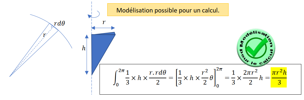 Une modélisation possible (en conservant la révolution) pour le calcul serait plutôt celle ci-dessous en considérant non pas un triangle, mais une pyramide à base triangulaire.