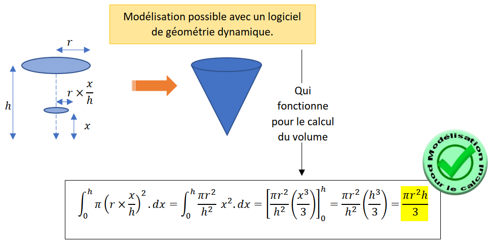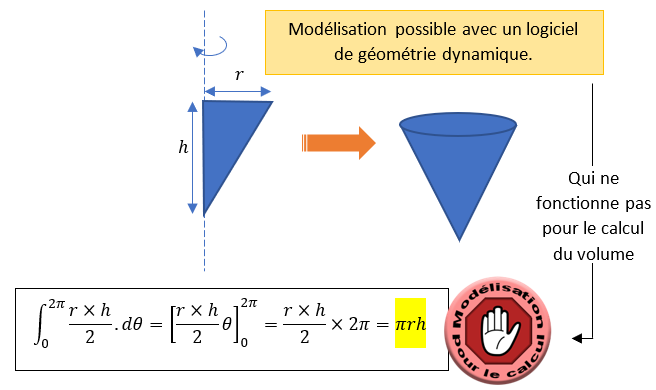 Dans le même état d’esprit, on peut modéliser le cône de révolution de deux manières différentes. Le cône de révolution ou le triangle rectangle qui « tourne » autour d’un axe permet d’obtenir une modélisation du cylindre géométriquement, mais ce n’est pas le bon choix pour modéliser le calcul du volume.