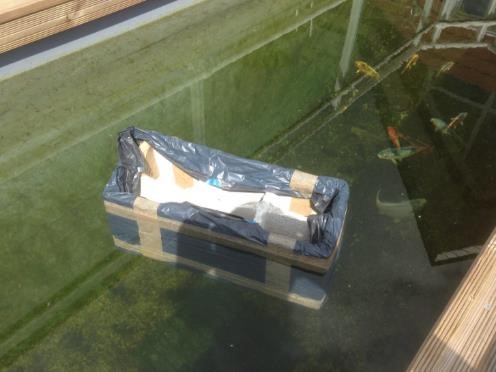 Le parpaing emballé dans un sac poubelle pour le rendre imperméable mais bien serré pour ne pas tricher en changeant le volume. | Le parpaing flotte au-dessus des poissons ! |
