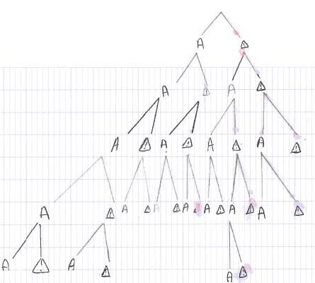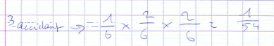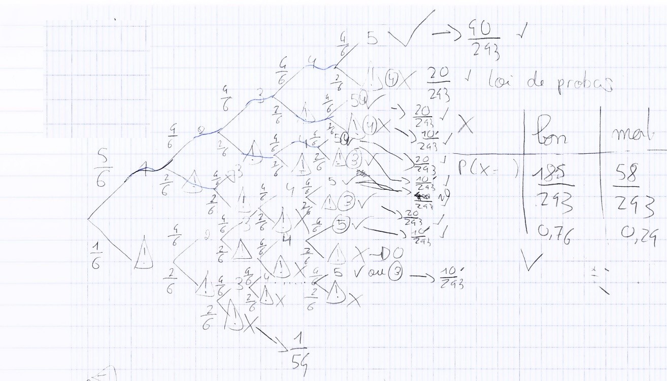 L’arbre peut être exploité pour obtenir la probabilité d’avoir une chute sur un lancer de 5 dés. Celle-ci est de 58/243 soit environ 24% d’après ce groupe d’élève. Le résultat est ici faux tous les cas de non chute ne sont pas comptabilisés.