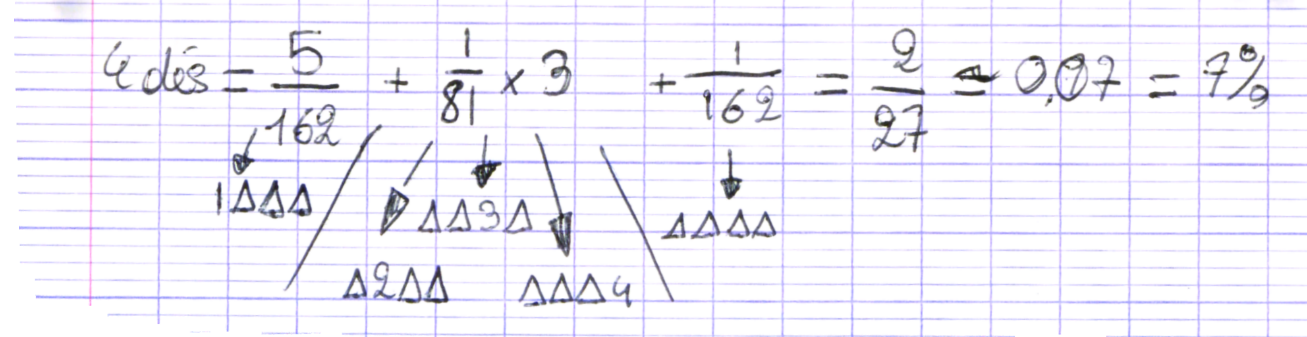 Dans ce cas, il faut que tous les dés indiquent « attention ». C’est le cas le plus facile en termes de combinatoire, mais il est utile pour débuter un raisonnement. Le passage à 4 dés pose alors un problème puisqu’il suffit d’avoir 3 « attentions » sur les 4 dés. Il faut donc considérer les différents cas possibles