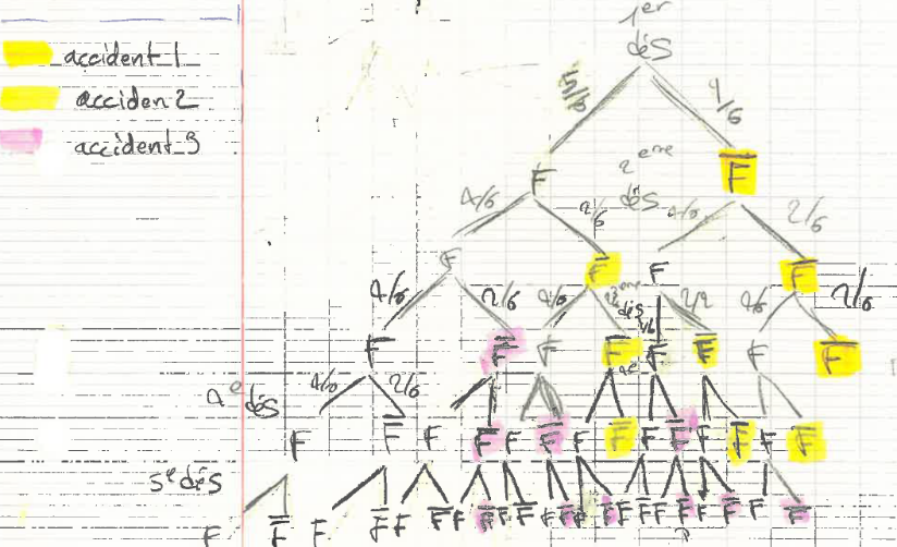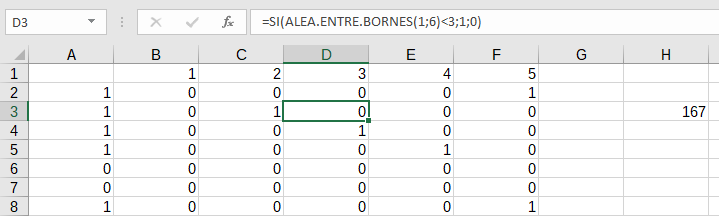 Les colonnes B à F représentent les dés et indiquent 1 lorsque le panneau « attention » est obtenu. La colonne A fait la somme des autres colonnes et indique donc s’il y a un accident sur un tirage.