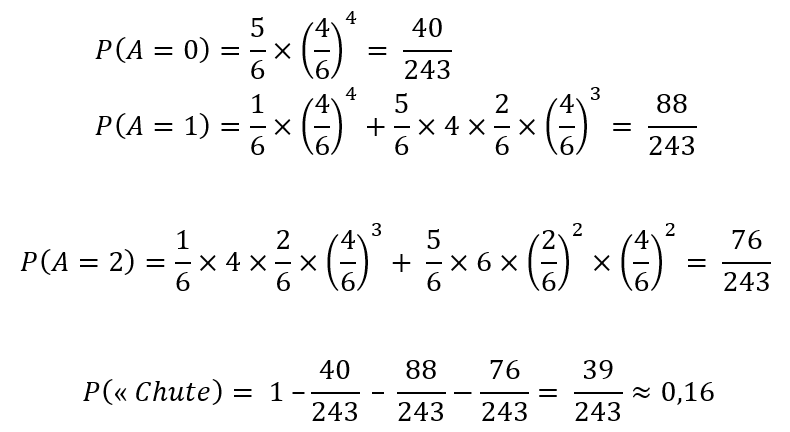La probabilité d’une chute en lançant les cinq dés est d’environ 16% ce qui correspond à la simulation.