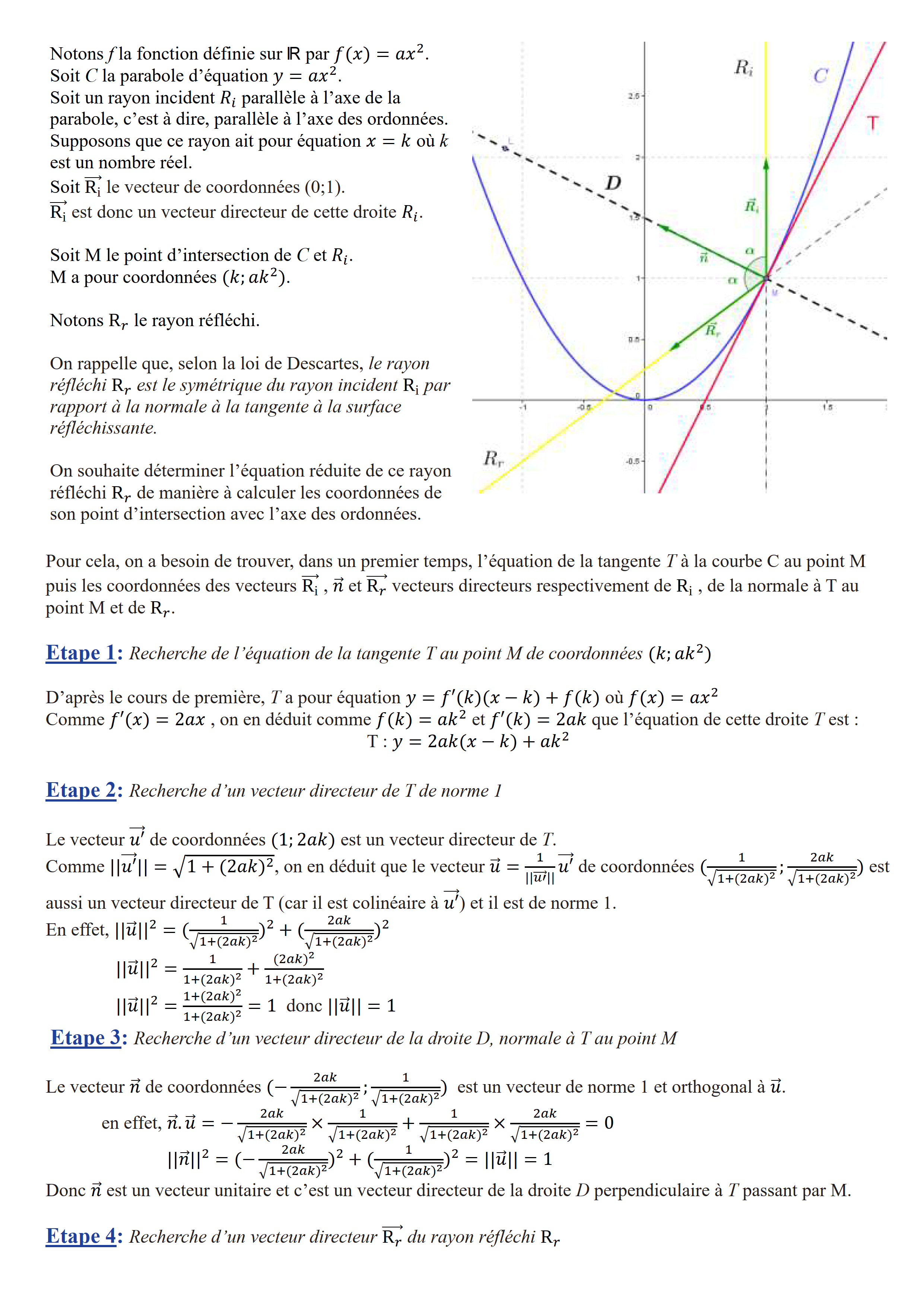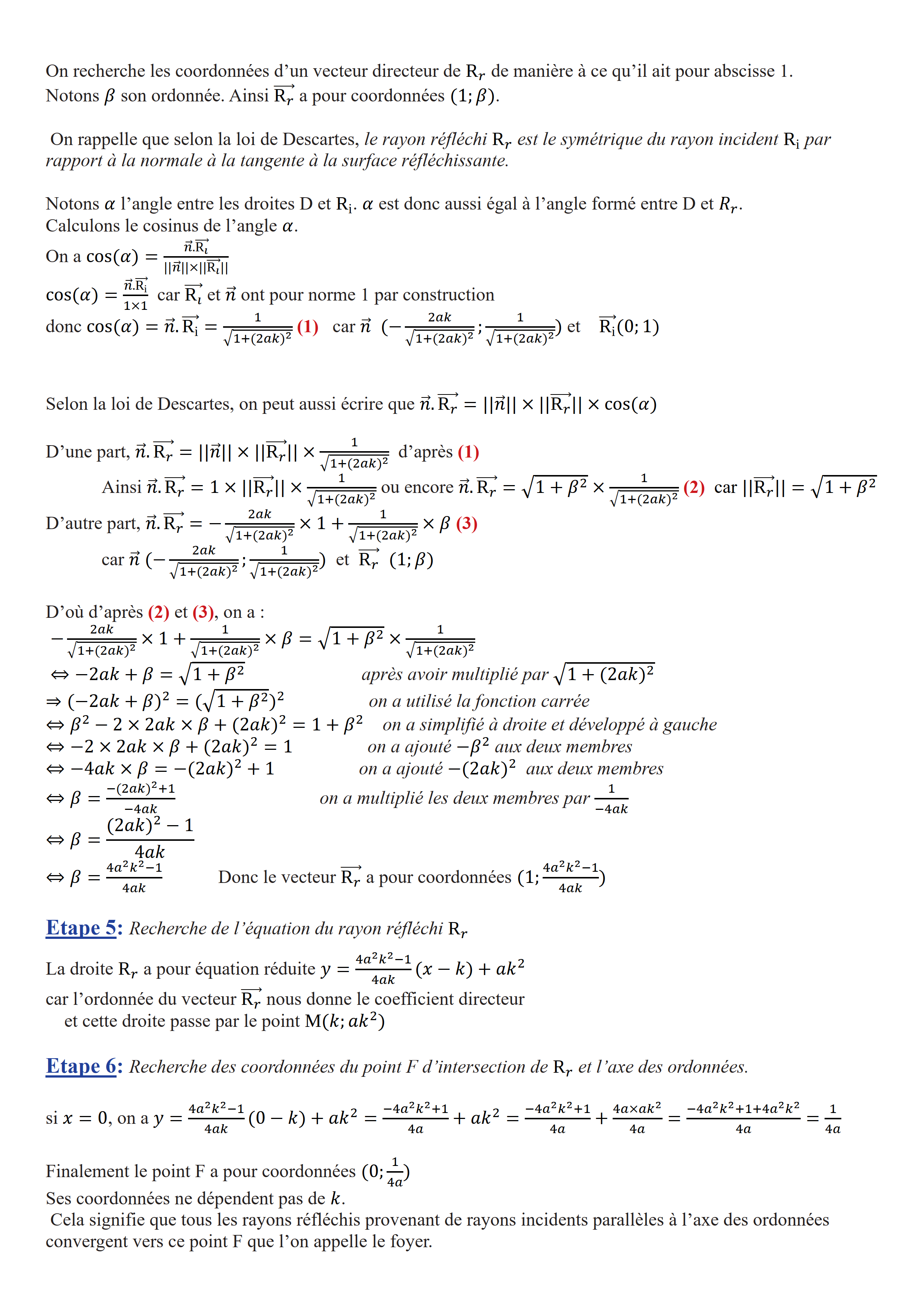 Objectif : Dans ce qui suit, on souhaite démontrer que les rayons réfléchis issus de la rencontre entre une parabole et des rayons incidents parallèles à l’axe de symétrie de cette parabole convergent tous vers un point.